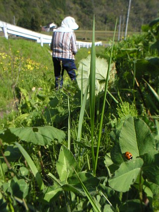 山菜のコゴミを摘んでくれてるおばちゃん♪