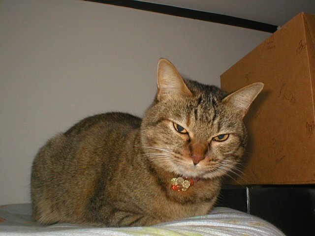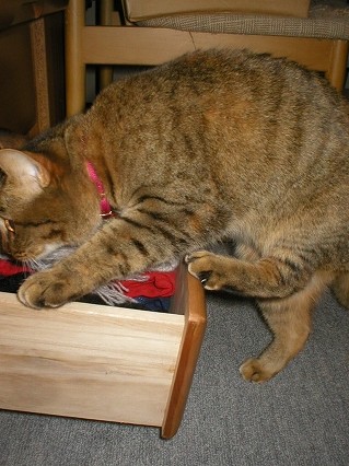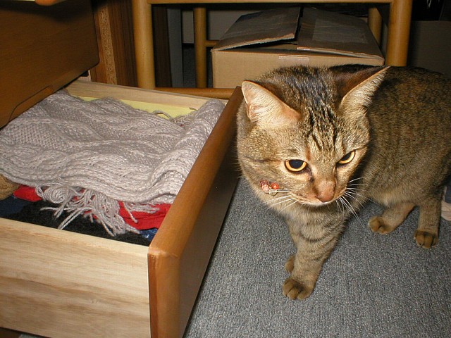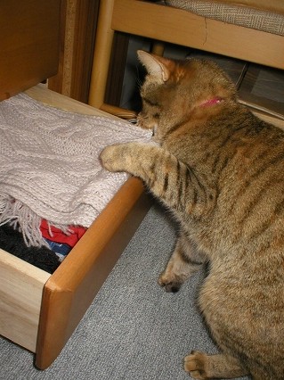 洋服ダンスの上からかあちゃんを見下ろすみーや。