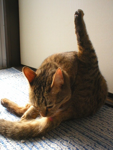 窓越しの日差しだけの室内で毛繕い中のみーやをパチリ☆